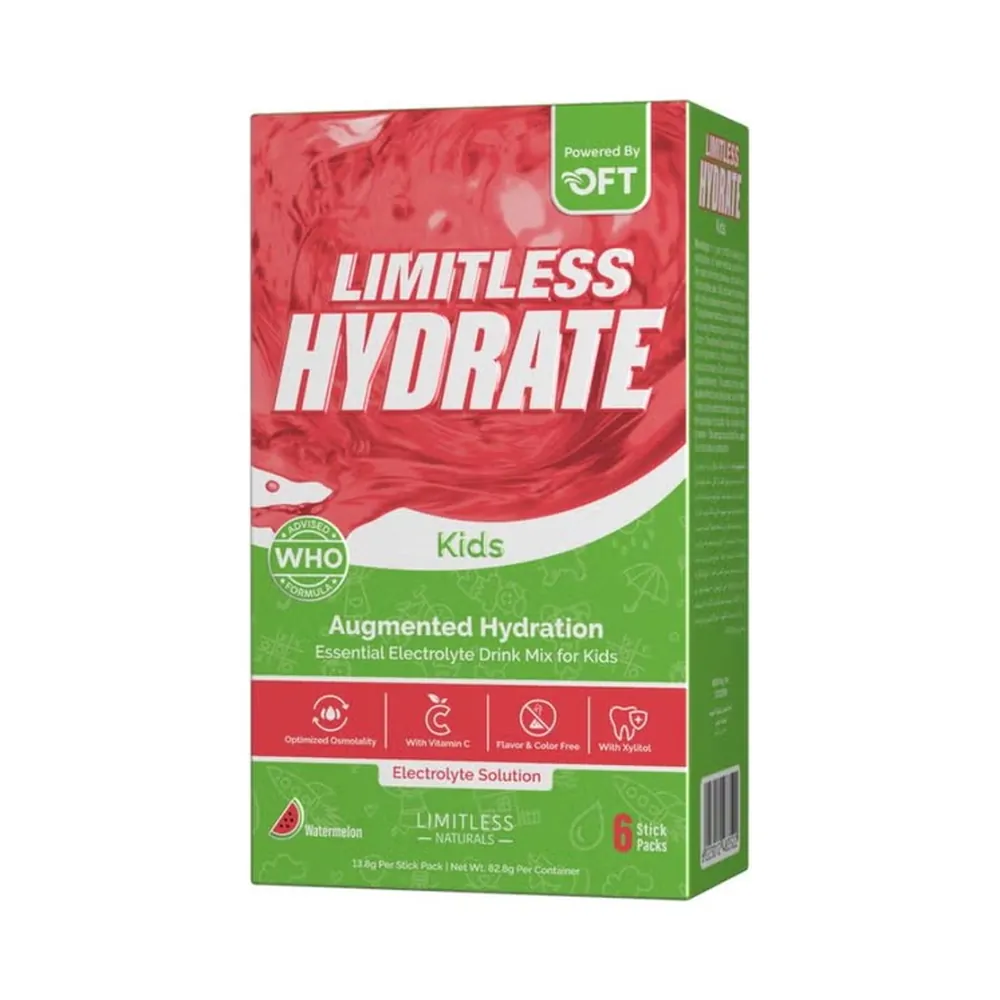 Limitless Hydrate Kids provides a gentle, WHO-inspired electrolyte formula specifically balanced for children to restore essential fluids and minerals lost through play, heat, or illness.